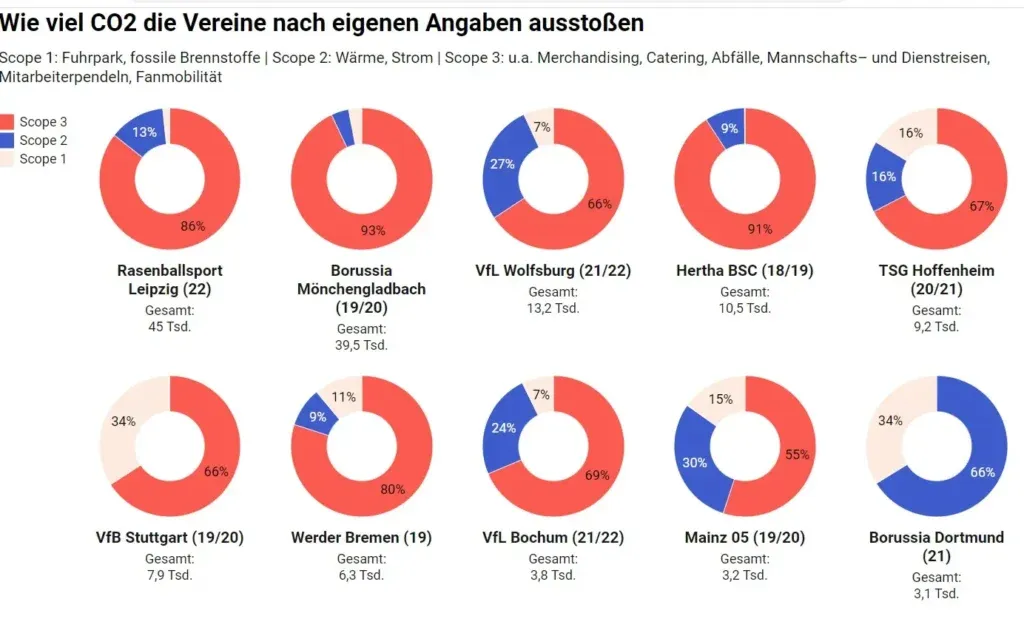 Die zehn Emissionsbilanzen jedoch erlauben einen Blick auf das Chaos der Daten. Denn: Jeder misst, wie er will, die DFL gibt nur wenige Mindestkriterien vor. So liegt RB Leipzig mit einem jährlichen CO2-Fußabdruck von 45.000 Tonnen an der negativen Spitze der zehn Teams. Borussia Dortmund kommt mit nur 3.120 Tonnen auf den geringsten Wert, dazwischen liegen etwa Gladbach (39.469 Tonnen), Hertha (10.550 Tonnen) und Hoffenheim (6.386 Tonnen).
