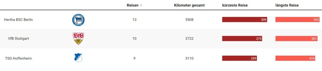 Wie groß die Angst vor echter Transparenz in der Liga ist, zeigt sich bei den Flügen der Mannschaften zu Auswärtsspielen. Nur drei Klubs geben Auskunft: Hertha BSC, der VfB Stuttgart und die TSG Hoffenheim. Die Hertha flog 2022 13 Mal, die kürzeste Strecke führte sie ins knapp 400 Kilometer entfernte Ruhrgebiet zu den Spielen in Dortmund und Bochum. Der VfB Stuttgart nahm zehn Mal den Flieger in der Saison 21/22, auch zu den Spielen in Köln und Leverkusen, was jeweils nur 275 Kilometer Flugstrecke entspricht. Hoffenheim flog in der vergangenen Saison zu neun Spielen, die kürzeste Strecke führte nach München, das gerade einmal rund 240 Kilometer Flugstrecke entfernt liegt. “Wir bewegen uns hier immer wieder in einem Spagat zwischen Verantwortungsbewusstsein und den Anforderungen des Spitzensports”, sagt TSG-Nachhaltigkeitsmanager Stefan Wagner. “Daher finden wir die Debatte um Kurzstreckenflüge auch unbedingt richtig.”