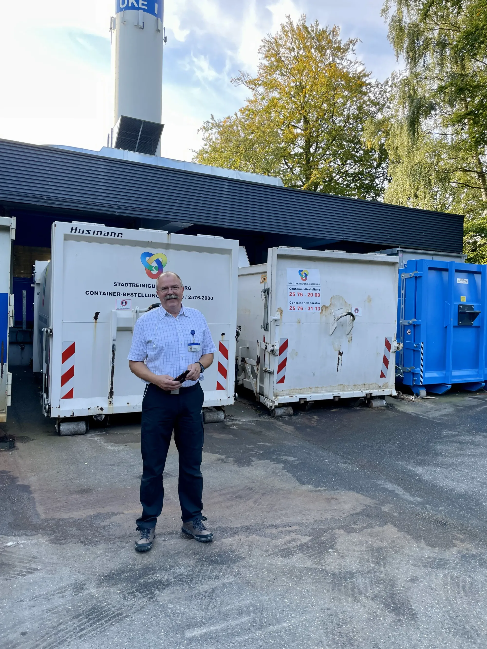 Heiko Schlüter trägt ein kariertes Kurzarmhemd und Wanderschuhe. Er ist 63 Jahre alt, lacht viel und grüßt fast jeden, der ihm entgegenkommt. Vor einer Müllpresse bleibt er stehen und drückt einen roten Knopf. Es quietscht und knarzt. Jede Woche drückt die Presse 4.000 Kilo Papier und Pappe zusammen. „Wenn dort ein falsches Teil landet, muss alles verbrannt werden“, sagt Schlüter. Das Entsorgungsunternehmen wäre „erstaunt”, wenn er falsch sortierten Müll abgeben würde. Insbesondere von Krankenhausmüll kann schließlich eine Infektionsgefahr ausgehen.
