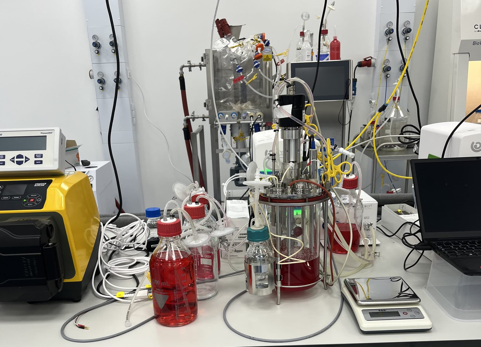 Die Zellen kommen mit der Nährlösung in einen sogenannten Fermenter, ein Glasgefäß, in dem sie umhergewirbelt werden, damit sie nicht an der Oberfläche haften bleiben. Nur so können richtig viele Zellen wachsen.