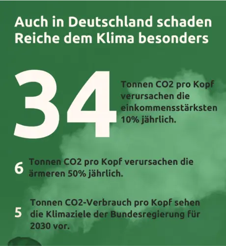 Das gilt nach einer Auswertung des World Inequality Lab auch für Deutschland. Die Menschen der ärmeren Hälfte der Bevölkerung verursachen demnach im Schnitt rund sechs Tonnen CO₂ pro Jahr. Damit liegen sie nur knapp über dem, was die Klimaziele der Bundesregierung für 2030 mit rund fünf Millionen pro Kopf vorsehen. Die einkommensstärksten zehn Prozent der Deutschen aber sind im Schnitt für 34 Tonnen pro Kopf verantwortlich, mehr als das Sechsfache des angestrebten Pro-Kopf-Ausstoßes für 2030. Die steigenden Emissionen der Reichen konterkarieren die Erfolge der ärmeren Hälfte der Bevölkerung.