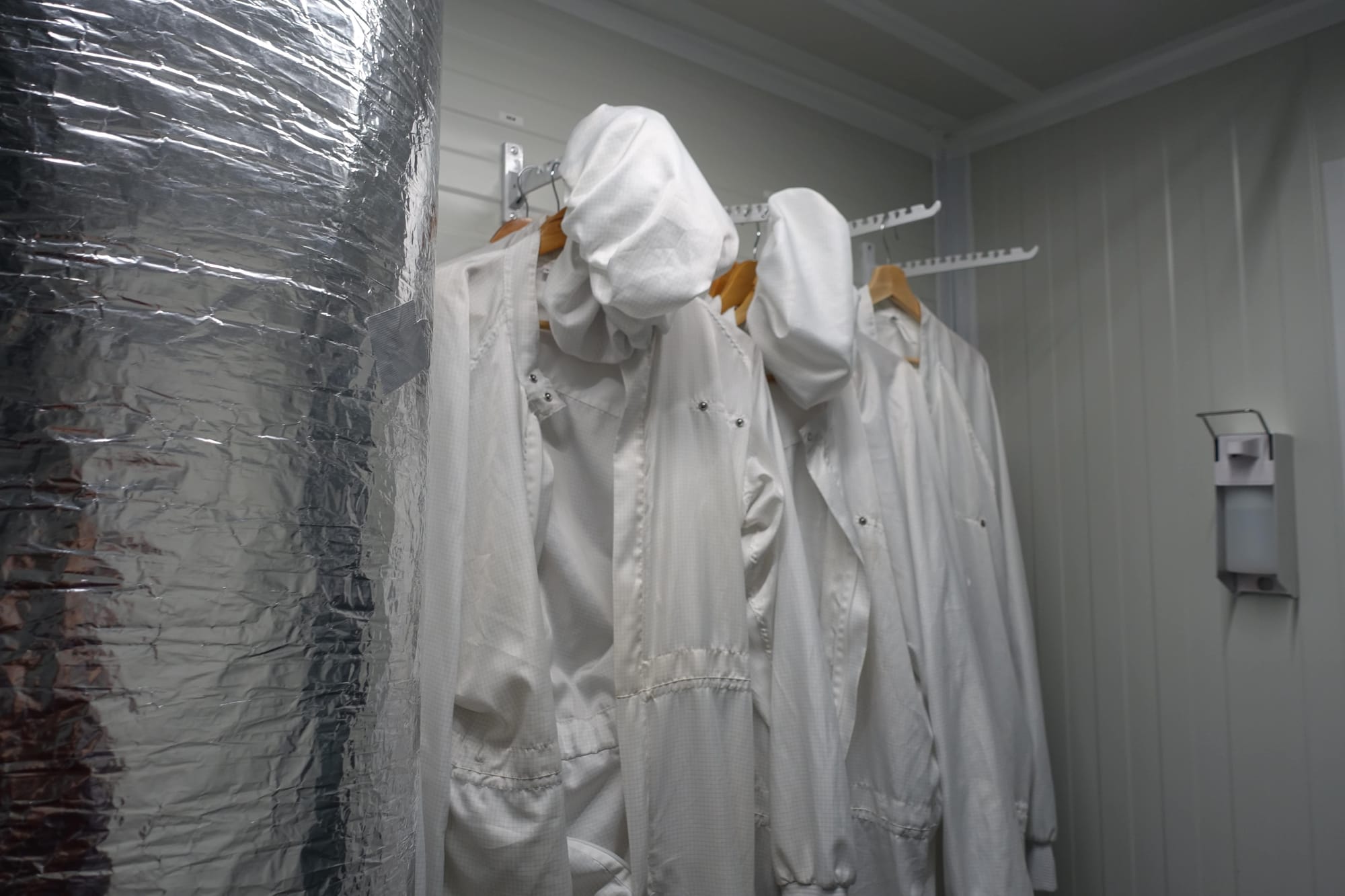 Bevor man in die sogenannte “Hygienezone”, also den Bereich mit den Erdbeeren darf, geht es zuerst durch eine Art Schleuse. Damit man keine Schädlinge einschleppt, wird man mit Druckluft abgesprüht, die Hände desinfiziert. Dann streift man sich Schutzanzug, Kopfbedeckung und Plastikschuhe über.