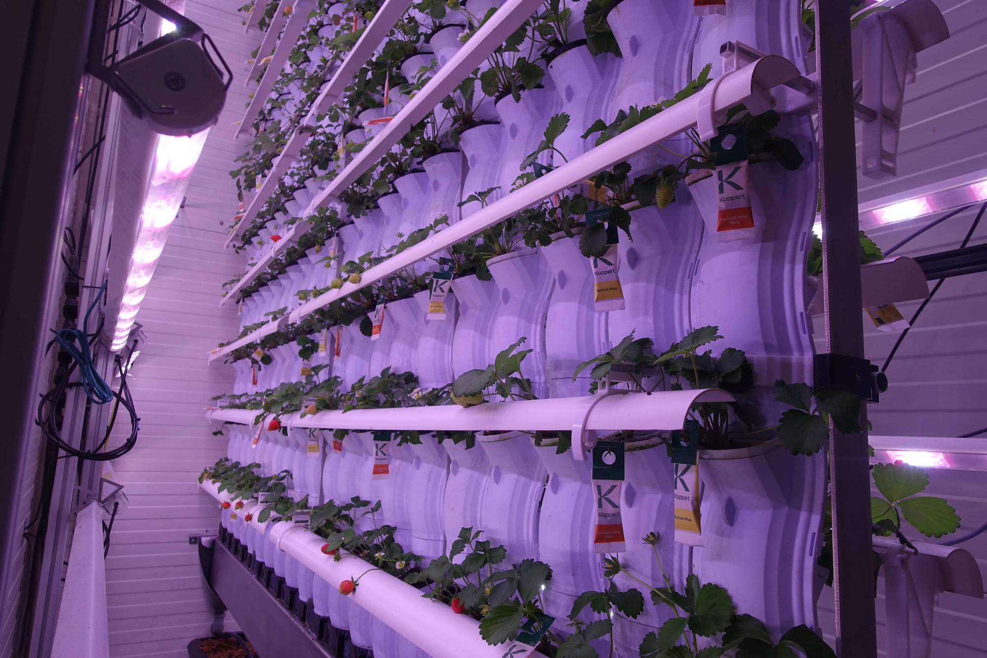 In der Hygienezone steht man dann vor einer Art ausziehbarem Regal, 3,50 Meter breit. 5,50 Meter hoch. Etwa 600 Erdbeerpflanzen wachsen hier über- und nebeneinander. Zwei Mal pro Woche wird geerntet, alle sechs bis zehn Monate müssen die Erdbeerpflanzen durch neue ausgetauscht werden. Insgesamt komme man mit diesem Prototyp-Modul auf etwa eine Tonne Erdbeeren pro Jahr. Auf einer richtigen, industriellen Farm hätte man 100 bis 1000 solcher Module.