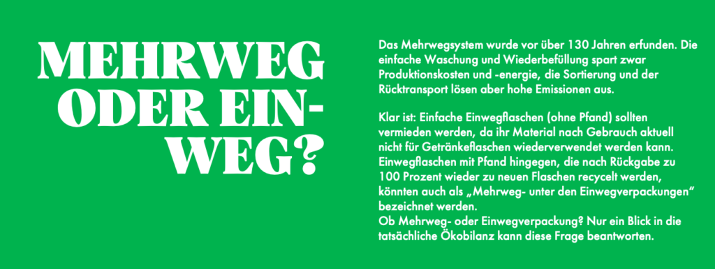 Die Lidl-Kampagne suggeriert, dass Einweg mindestens genauso gut wie Mehrweg ist. So steht unter der Überschrift “Mehrweg oder Einweg?” auf der Kampagnen-Website: “Das Mehrwegsystem wurde vor über 130 Jahren erfunden” und dass die Sortierung und der Rücktransport bei diesem System hohe Emissionen auslöse. Zwar sagt Lidl an keiner Stelle eindeutig, dass Einweg wirklich besser sei. Aber der Eindruck kann beim Leser leicht hängen bleiben. Auch auf Nachfrage von Flip räumt Lidl indirekt ein, dass es dem Konzern um mehr nur als nur die eigene Flasche geht: Man wolle “fest verankerte, aber inzwischen überkommene Vorstellungen hinsichtlich der Umwelt- und Klimabilanz von Getränkeverpackungen” aufbrechen.