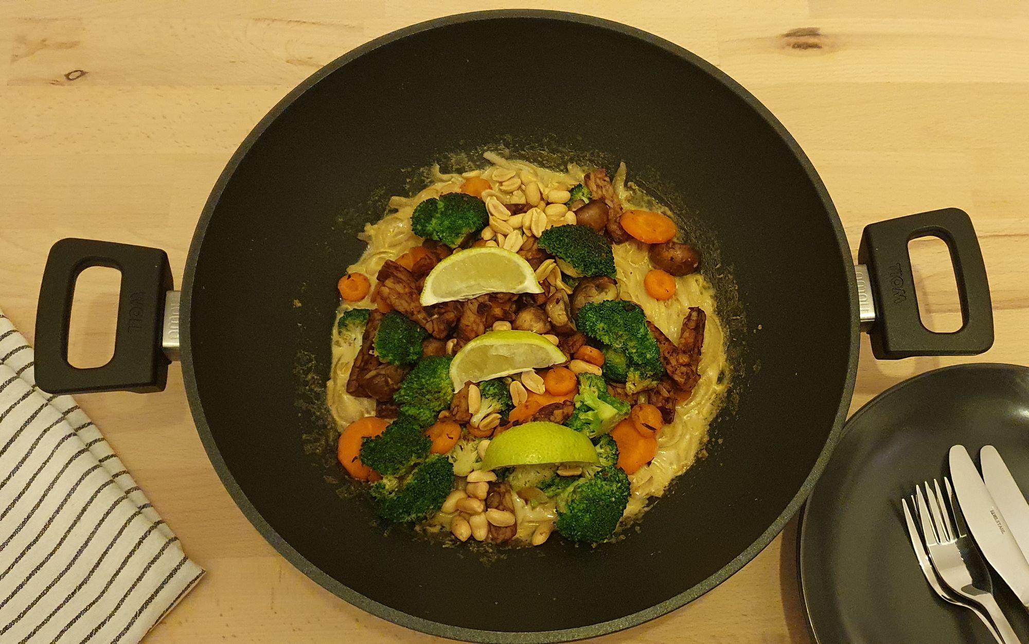 - Ist das Gemüse fertig gebraten und beiseite gestellt, werden die Nudeln in den Wok gegeben und mit der Soße übergossen. Anschließend das Gemüse hinzufügen und sofort servieren. Für das Topping je nach Belieben geschnittene Limette, Erdnüsse und gehackten Koriander ergänzen.