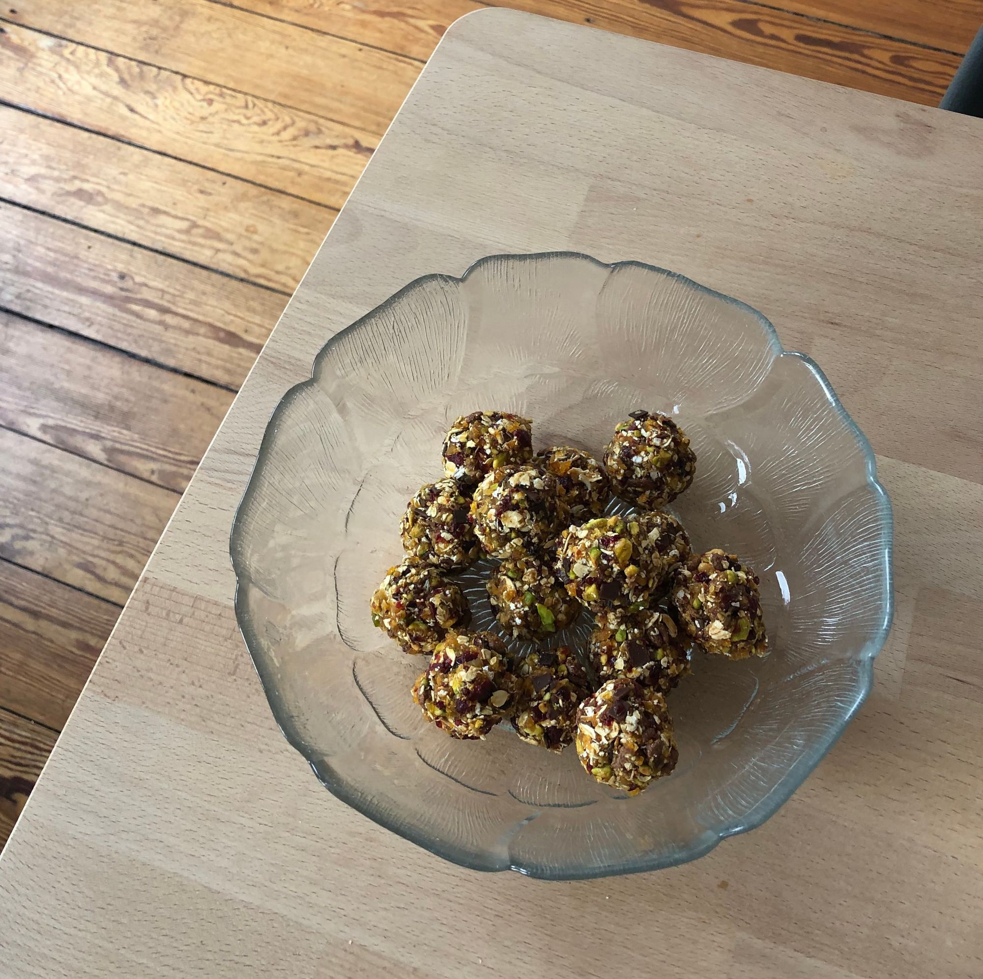 - Aprikosenpüree, Cranberries, Pistazien, Haferflocken und Müsli in eine Schüssel geben, gut miteinander vermengen und ca. 20 Kugeln daraus formen.