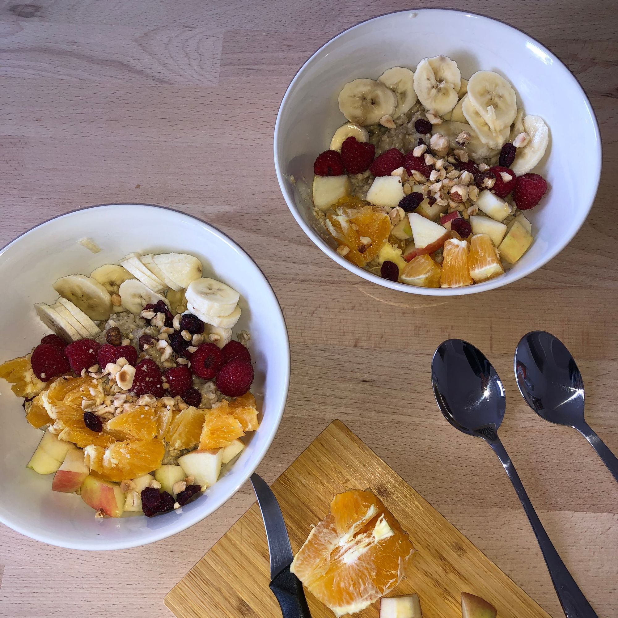 Als Frühstück haben wir uns für ein Porridge mit Nüssen und Obst entschieden. 200 Gramm Obst sind die mindestens empfohlene Menge pro Tag – ein Apfel kann diese schon fast decken. Besonders Nüsse sollten in Zukunft noch mehr gegessen werden: 50 g pro Tag empfiehlt die EAT-Lancet-Commission. Wer morgens gerne ein Frühstücks-Ei isst, sollte sich nach der Diät einschränken: Ein bis zwei Eier pro Woche sind höchstens vorgesehen.