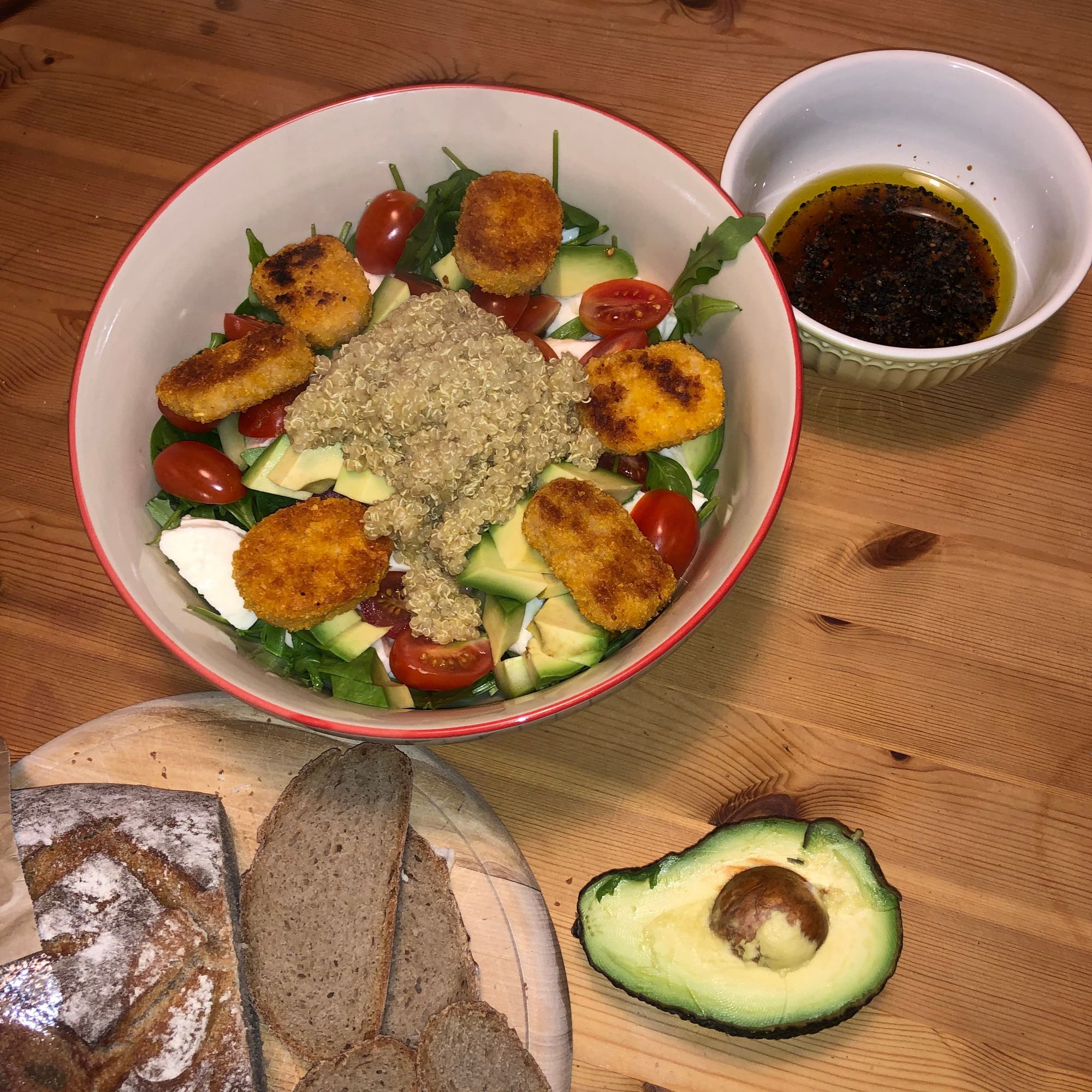 - Jetzt kannst du alles zusammen mit Essig und Öl in einer Schüssel vermischen und den Salat mit etwas Brot servieren.