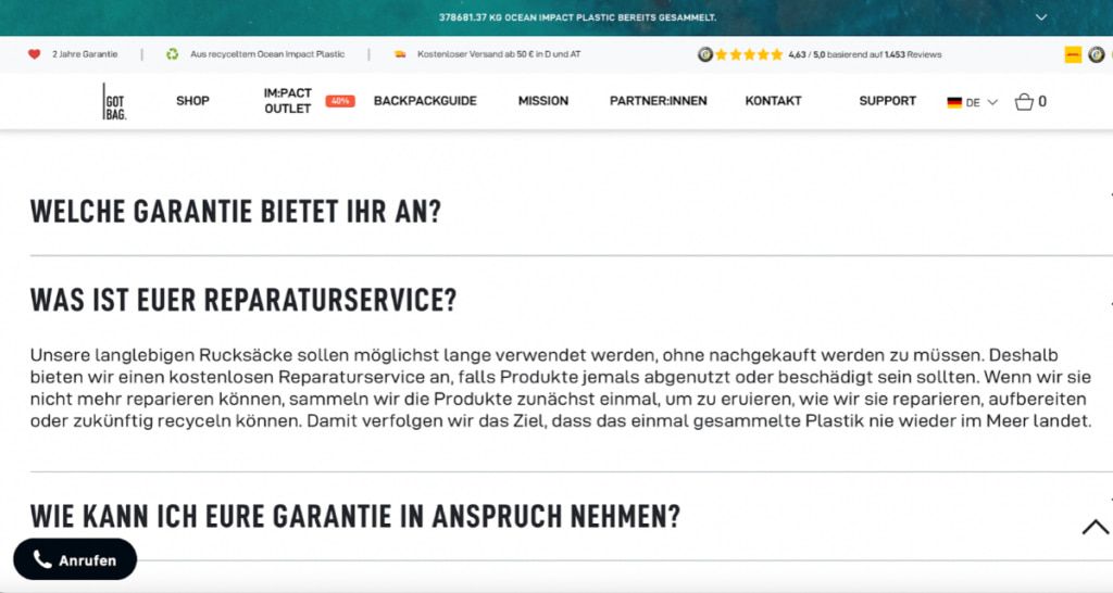 Obwohl Got Bag selbst noch keine Lebenszyklusanalyse erstellt hat, warb es bis vor kurzem mit konkreten Zahlen. Mit jeder Tonne geretteten Plastik, spare man “3,8 Barrel Öl, 1.700 Liter Wasser und über 139 Tonnen CO2-Emissionen im Vergleich zum Industrie-Standard.” Auf Nachfrage von Flip und ZEIT Online, wie das Unternehmen denn auf diese Zahlen gekommen sei, antwortet Mandos schließlich, man habe sich bei den Emissionen verrechnet und den angegeben Wasserverbrauch “nicht validieren können“. Man habe sich daher entschieden, die Zahlen “von unserer Homepage zu nehmen bis wir validierte Daten vorliegen haben.” Auch ein beworbener “Reparaturservice” verschwindet von der Website nachdem auf Nachfrage deutlich wird, dass es einen Näh- oder Schweißservice noch gar nicht gibt.