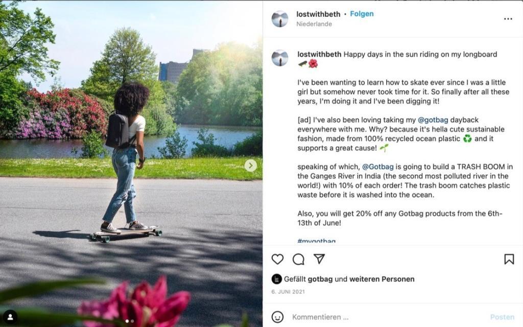 In vielen Online-Shops und auf Instagram wird der Eindruck vermittelt, der Got Bag bestehe aus “100 % recyceltem Meeresplastik”. So schreibt die Influencerin Lostwithbeth in einer Instagram-Werbung für Got Bag: “Es ist super-süße nachhaItige Bekleidung aus 100 Prozent Meeresplastik.” Got Bag hat auf den Gefällt-Button geklickt.