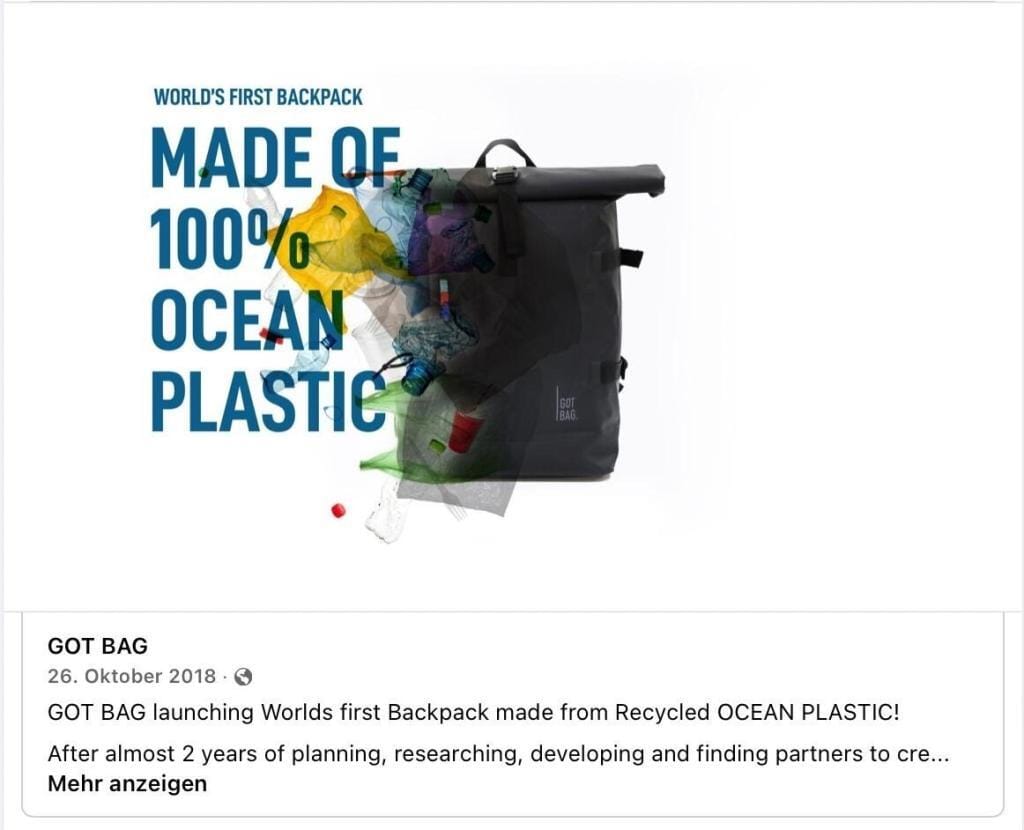 Warum der Rucksack dann so oft mit “100 Prozent Meeresplastik” beworben wird? Die Influencer und Shops sagen, dass sie die Informationen von der Website von Got Bag haben – sie dort aber nicht mehr finden. Mandos räumt auf Anfrage ein, dass das Unternehmen die “Daten zu unseren Geweben” in der Vergangenheit “nicht eindeutig von der Zusammensetzung der fertigen Produkte abgegrenzt” habe. Man habe den Slogan “Weltweit erster Rucksack aus Meeresplastik” häufig in Kombination mit der Aussage “Gewebe/Textil/Material aus 100 % Meeresplastik” genutzt. „Das heißt jedoch nicht, dass wir selbst unsere Rucksäcke oder das gesamte Produktsortiment aktiv als ‚aus 100% recyceltem Meeresplastik‘ beworben haben. Flip und Zeit Online liegen jedoch Belege vor, dass Got Bag genau das auf Facebook getan hat. „World’s first backpack made of 100 % Ocean Plastic“ heißt es dort. “Die Kunden wurden ganz klar getäuscht”, sagt Tristan Jorde von der Verbraucherzentrale Hamburg.