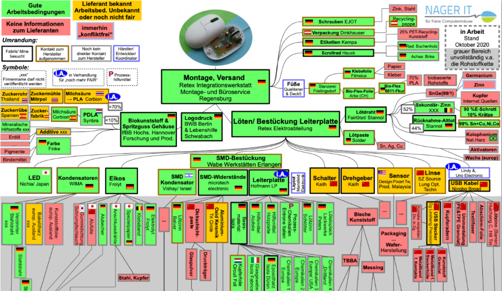 Vor allem im Bereich der Rohstoffhändler und verarbeitenden Betriebe am Anfang der Kette, wo die Gewinnung von Gold, Kupfer und Titan stehen, fehlen Informationen zu den Produktionsbedingungen. “Wir gehen davon aus, dass sie mit hoher Wahrscheinlichkeit als ‘unfair’ bezeichnet werden müssen”, heißt es auf der Homepage von Nager IT. Das allerdings will man, so gut es geht, ändern. „Wir sind zwar nur ein kleines Unternehmen, aber arbeiten ständig daran, unsere Maus noch fairer zu machen“, so Becker.