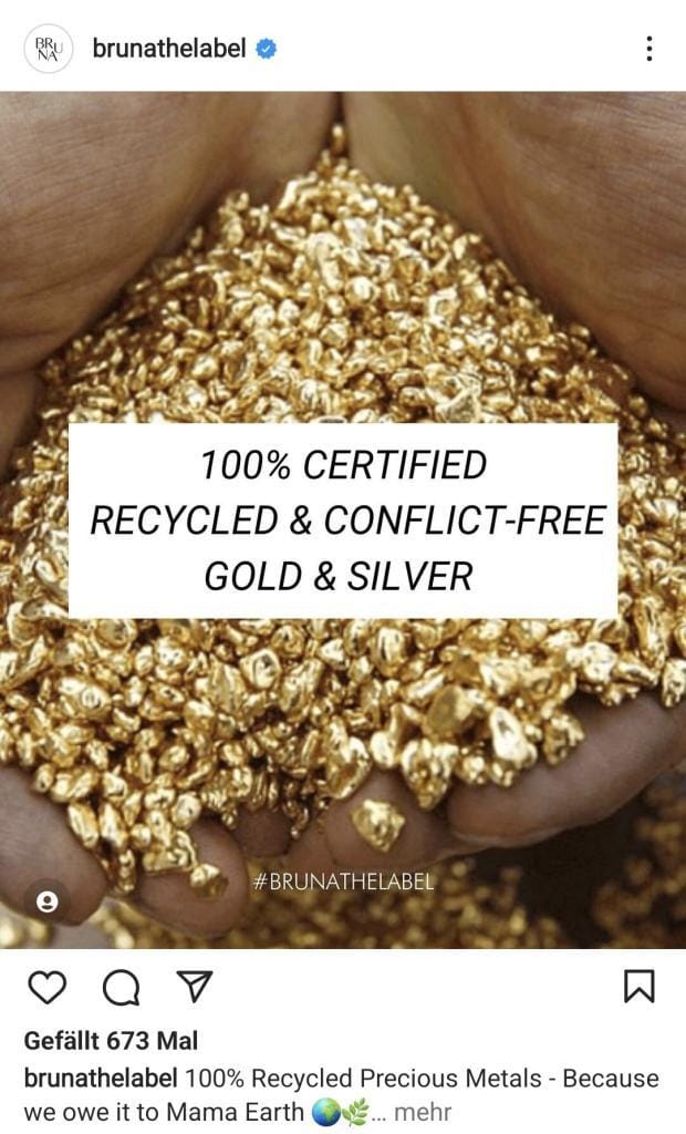 Bruna verspricht konfliktfreies Gold und Silber. Das liest sich erstmal schön. Aber auch hier lohnt es sich, einmal nachzufragen, was das überhaupt bedeuten soll. Gemeint ist mit konfliktfrei normalerweise, dass das Gold und Silber nicht zu Kriegen, Terror oder Ausbeutung beiträgt, weil es zum Beispiel aus Regionen und Minen stammt, in denen ein verantwortungsvoller Abbau möglich ist. Was aber soll es bedeuten, wenn es sich eh um 100 Prozent recyceltes Gold und Silber handelt, so wie Bruna angibt? Sind recycelte Edelmetalle nicht immer konfliktfrei? Oder bezieht sich die Aussage auf die ursprüngliche Gewinnung des Gold und Silbers in Minen, lange bevor es zum Recycling in den Fabriken von Umicore in Thailand und Belgien gelandet ist? Wie aber könnte Bruna das sicher stellen?